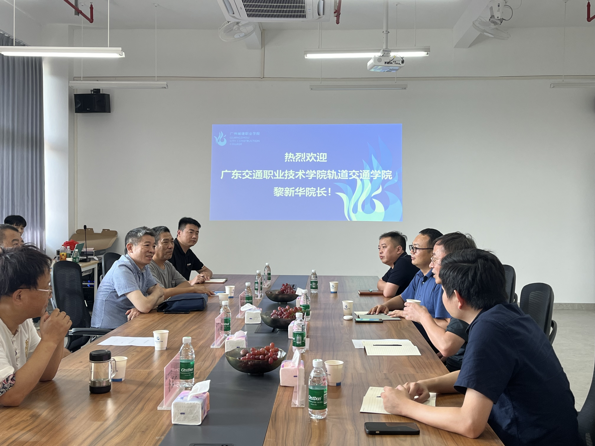 交流会上,罗意平院长首先代表学院对广东交通职业技术学院轨道交通学院黎新华院长一行的到访表示热烈欢迎。罗院长详细介绍了学校的发展历程、学院的师资队伍、专业建设、实训基地建设等方面的情况。双方在轨道交通的专业建设、课程建设、产教融合等方面达成了许多共识。黎新华院长表示广州城建职业学院轨道交通学院专业建设思路非常清晰,办公、办学条件已非常好,将全力支持广州城建职业学院轨道交通学院的专业建设、师资队伍建设、教学资源、实践实训基地建设。