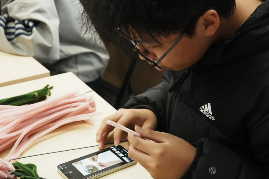 活动中,学生们在志愿者的指导下亲自动手制作扭扭棒花。他们认真观看教学视频,动手实践,将普通的扭扭棒编织成色彩斑斓的花朵。这一环节不仅让学生们享受到了动手创造的乐趣,更让他们深刻体会到了感恩的真谛。