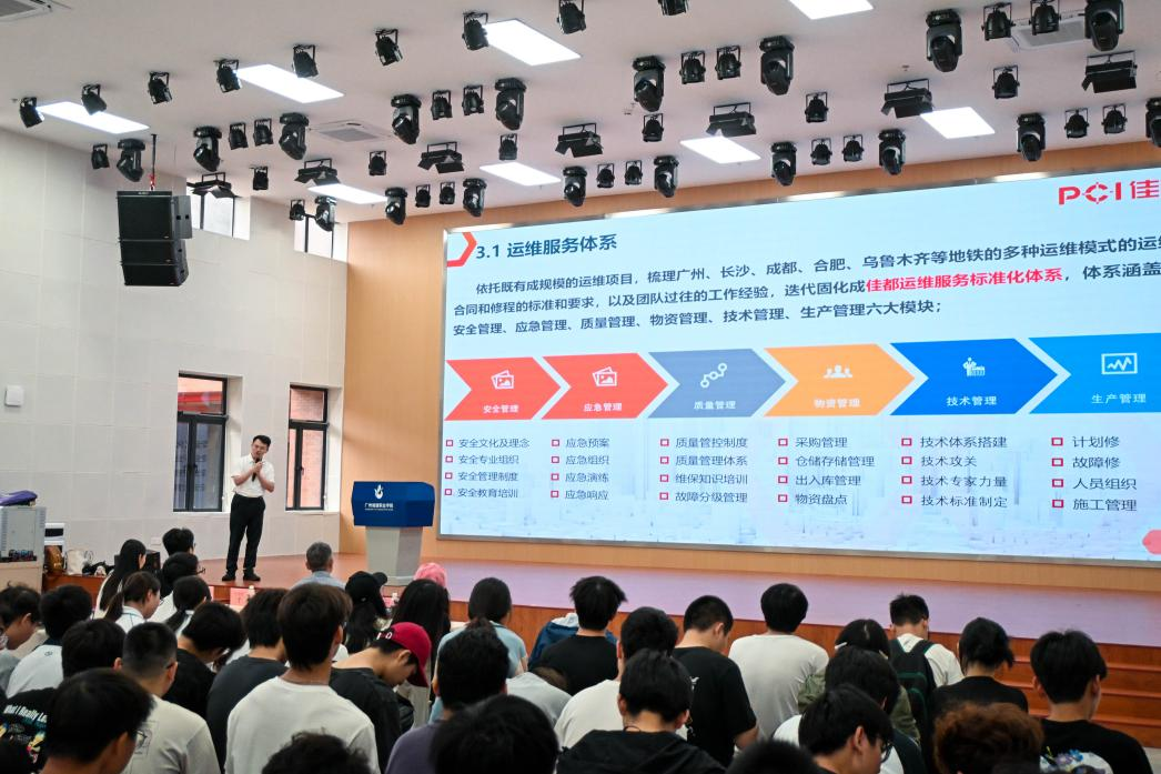 随后,黄梆副总监为25级订单班同学带来城市轨道交通运维服务介绍。佳都科技的运维服务覆盖广泛,主要包括通信设备、机电设备等30多种设备与系统的维护保养。