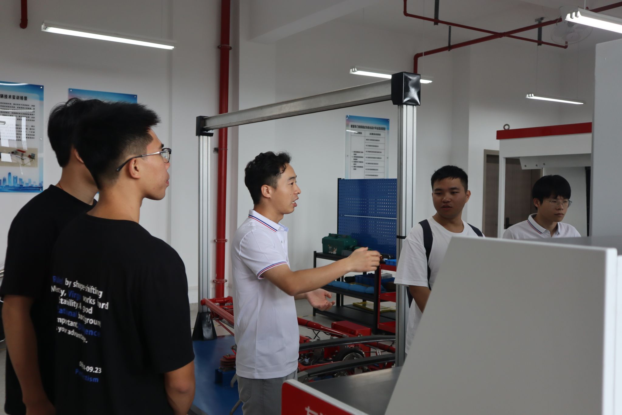 师生共同检查实训室环境:确认安全通道畅通(无杂物堆积)、应急照明正常、消防器材(灭火器、消防栓、急救箱)在有效期且可正常使用、地面无积水、油污(防止滑倒)。