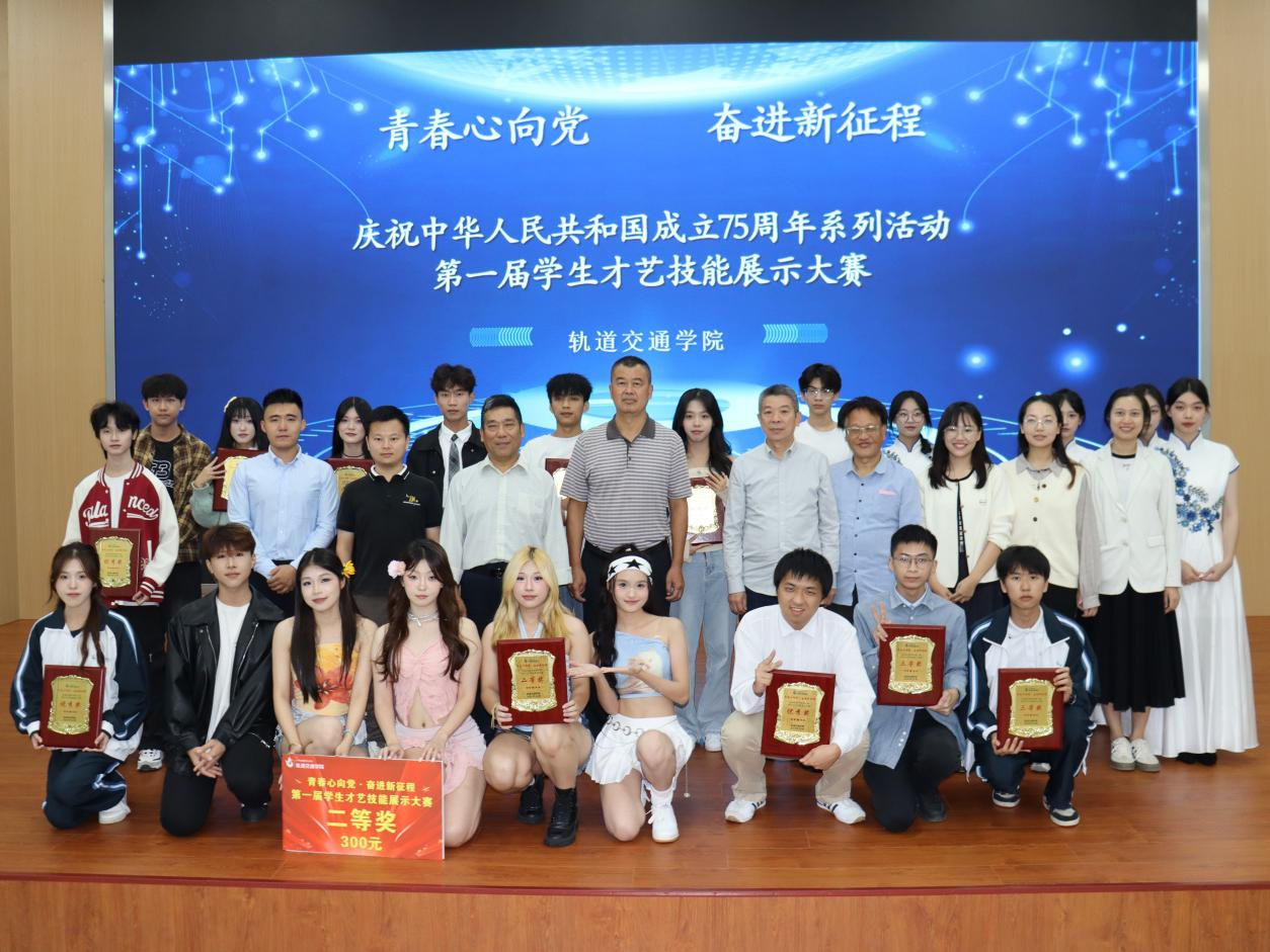 为庆祝中华人民共和国成立75周年,进一步激发青年学生的爱国热情,同时更好地丰富大学生的校园生活、营造一个积极、健康、朝气蓬勃的校园氛围,展现当代大学生良好的精神风貌,塑造有思想、有技能的当代大学生形象,10月31日晚,轨道交通学院成功举办“青春心向党、奋进新征程”庆祝中华人民共和国成立75周年系列活动暨第一届学生才艺技能展示大赛活动。学院直属党支部书记、院长罗意平、副院长李夏苗、学生处副处长曾德钦、各教研室负责人、学工办全体教师及学生代表300余人共同参加了活动。